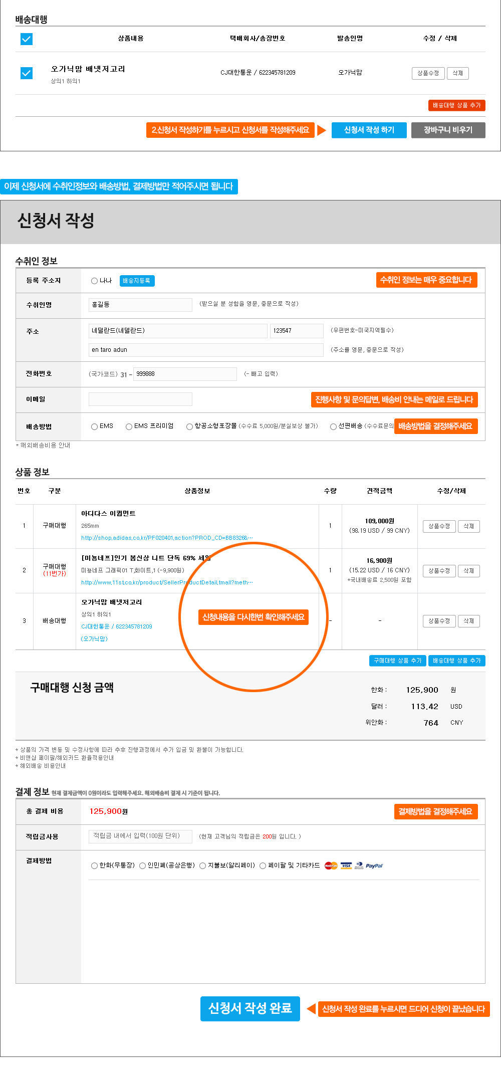 이후 주소 및 배송방법, 결제방법을